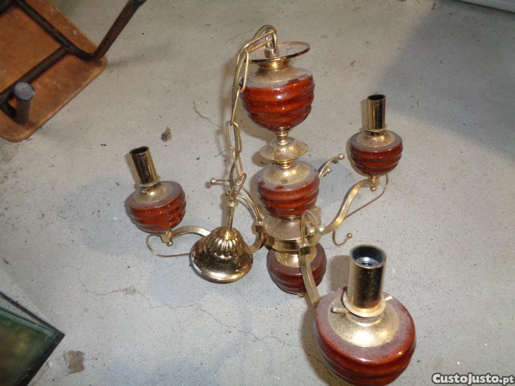 Candeeiro de teto de 3 lâmpada nuas feito em latão e loiça