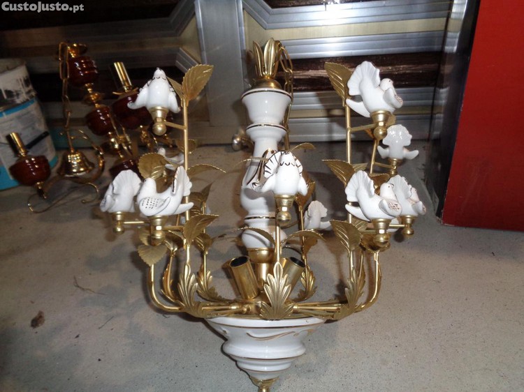 Candeeiro de teto feito em latão e as pombinhas em porcelana branca com fio dourado, como nôvo e muito bonito, se tiver interesse também arranjo 2 de mesinha de cabeceira, do mesmo conjunto