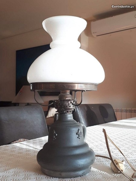 Descrição: candeeiro da marca Medieval, com base em estanho (95%) e chaminé em vidro opalino.