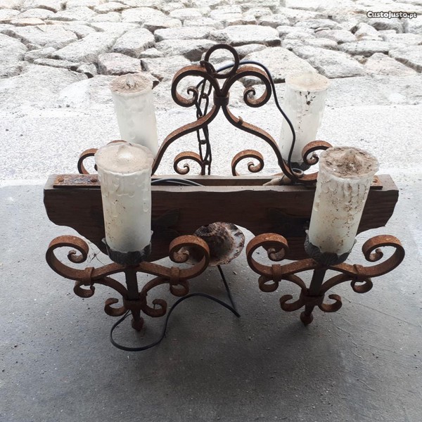 Candeeiro velho, cheio de ferrugem e pó, mede 60 cm x 30 cm x 43 cm de altura. Tem 4 tulipas em vidro, em muito bom estado.