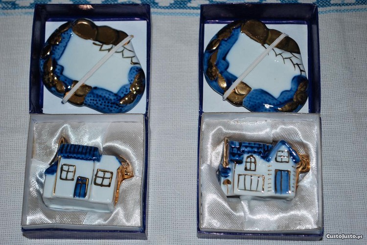 Casinhas com caixa em louça vidrada, tons de branco/azul/dourado - para decoração, para oferta, etc