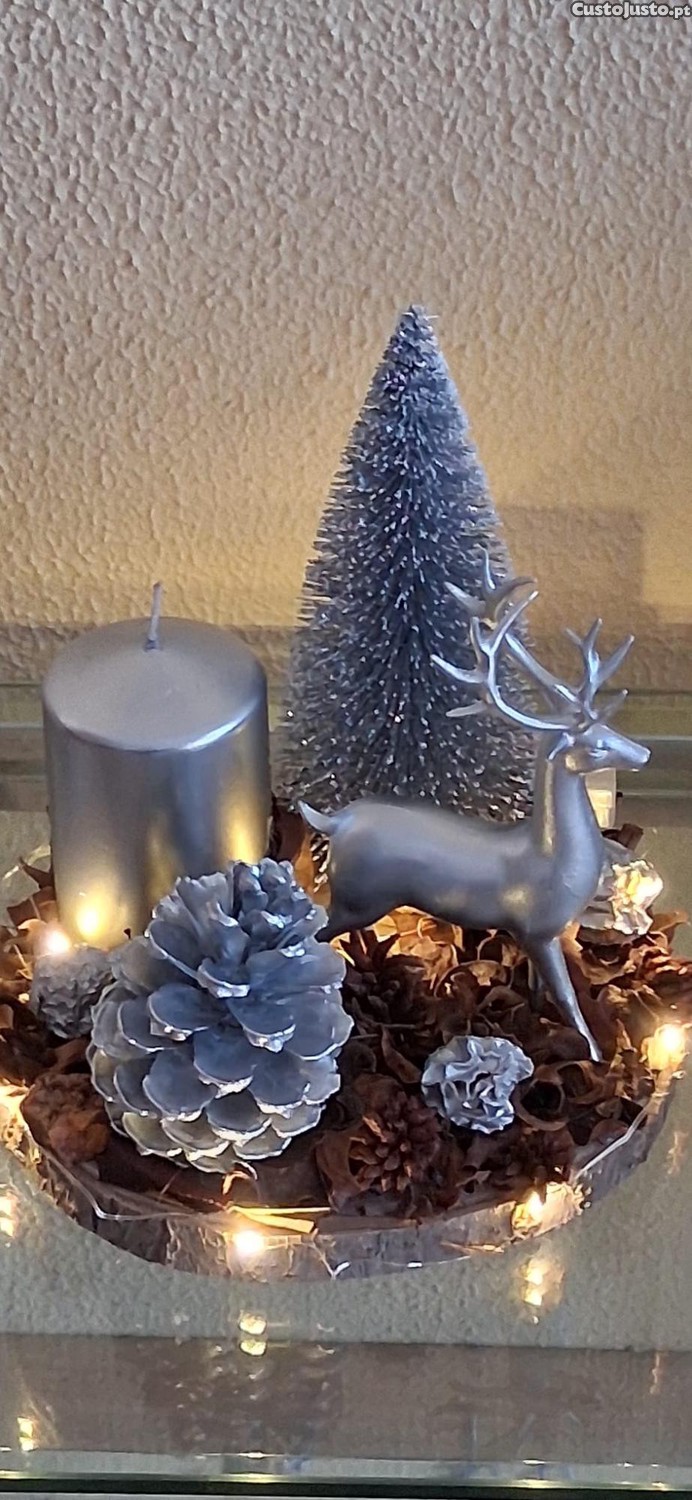 Elegante centro de mesa natalício com elementos decorativos em tons cinza prateado. Inclui árvore de natal, vela e figura decorativa de veado. Diâmetro 23cm