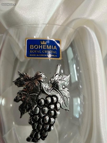 Conjunto de 6 copos e jarro em cristal da BOHEMIA (Royal Cristal)com aplicações em estanho puro a 95% SN, com autocolante de origem