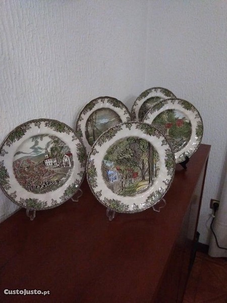 Conjunto de cinco pratos decorativos, como novos.