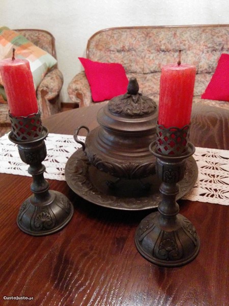 Preço: 150 €Conjunto em estanho, terrina e castiçais com velas