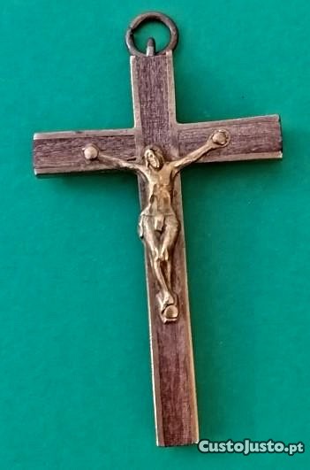 Crucifixo com cruz em metal e madeira, e Cristo em metal amarelo.