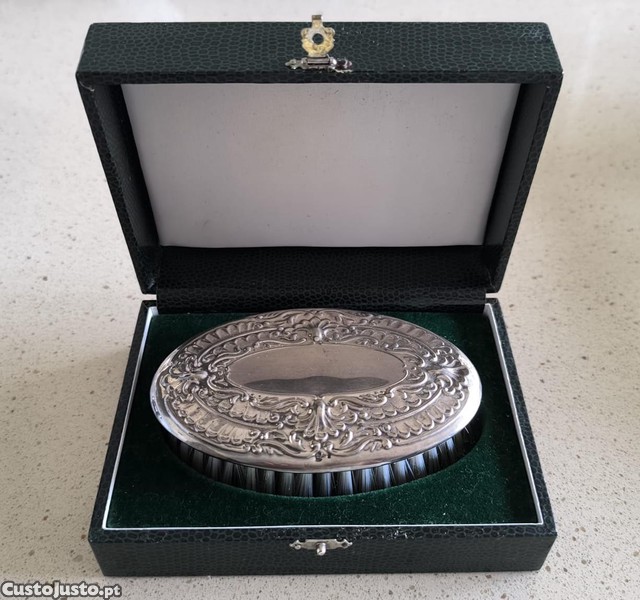 Escova em prata trabalhada, com estojo verde (as dobradiças do estojo estão um pouco enferrujadas)