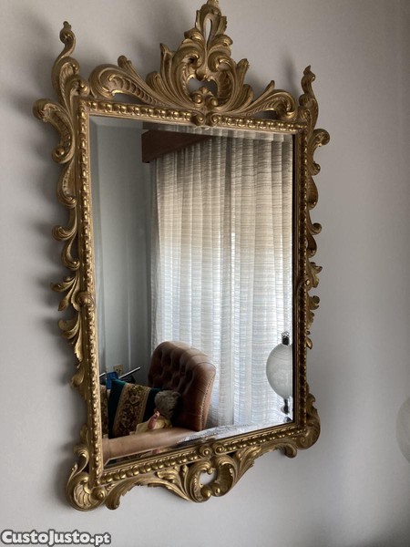 Vendo espelho com moldura dourada. Medidas aproximadas: altura 106cm, largura máxima 62cm. A retirar junto ao Corte Inglès de Gaia.