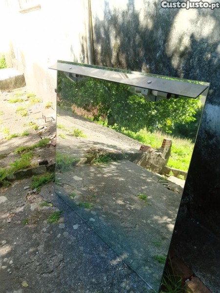 Espelho com as seguintes medidas: Comprimento=1,04mt; Altura=98,0cmt. De 4 lâmpadas e as respectivas ligações eléctricas. Com um outro espelho em cima. Lâmpadas não incluídas. Numa das laterais está um pouco gasto.