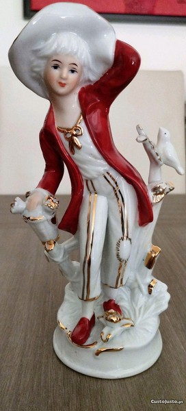 Estatueta em porcelana do Sri Lanka, pintada á mão,com motivo Menina no Bosque. Cores: Branco, vermelho e dourado. Altura: 19,5cm; largura: 10cm.