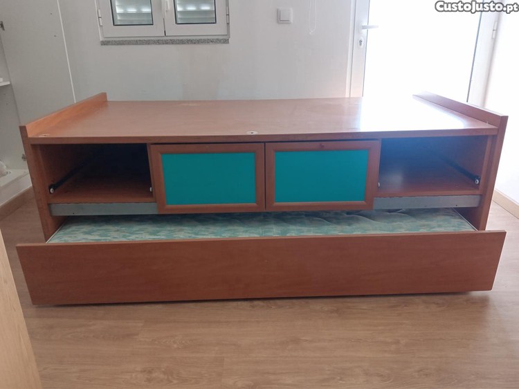 Estúdio com gavetão e mesa..Móvel de arrumação.com colchão. No gavetão tem um colchão e no tampo outro.