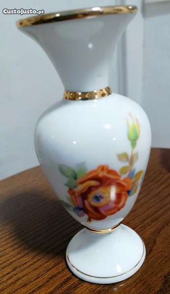 Jarra de oratório em porcelana Coimbra S.P., branca, com dupla decoração floral policromada, e filetes dourados na aba, centro e base.