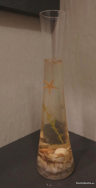 Preço: 9 €Jarra Vidro, Alta, com gel e estrelas e conchas e búzios do mar Altura: 27 cm