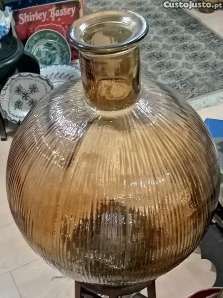 Jarro estilo garrafão em vidro acastanhado, esférico, com caneluras e base circular, tendo a altura de 40cm, o diâmetro central do bojo de 33cm.