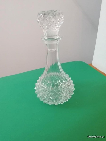 Licoreiro em cristal com decoração de picos na base, com a altura de 27cm e diâmetro de 14cm.