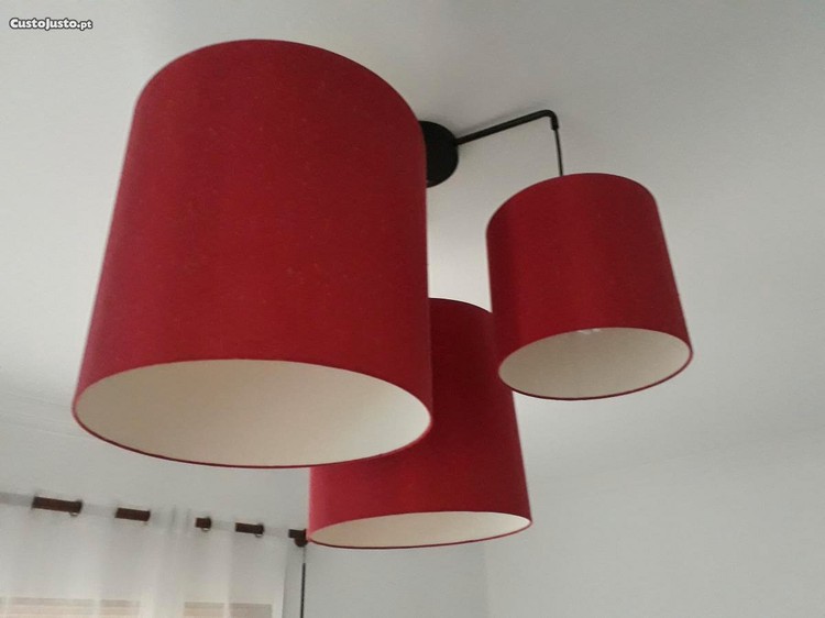 Lustre com 3 abat-jour. Em metal e tecido ( plastificado no interior) de cor vermelho escuro. Alturas reguláveis.