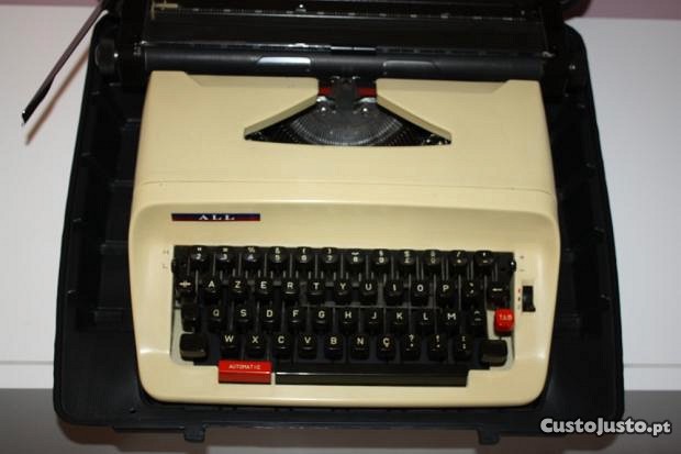 Máquina de escrever All original a funcionar com mala. A tecla "O", de Organização, está com defeito, e fica presa, sendo que só trabalha minimamente bem, em formato maiúscula.