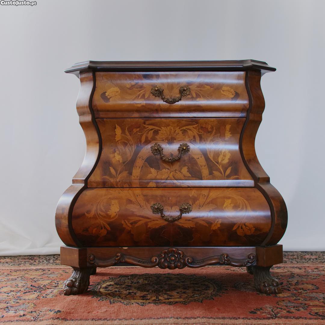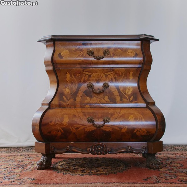 Esta meia cómoda com design requintado e elegante, com quinas chanfradas e salientes em bombé, destaca-se pela sua rica decoração em marchetaria.