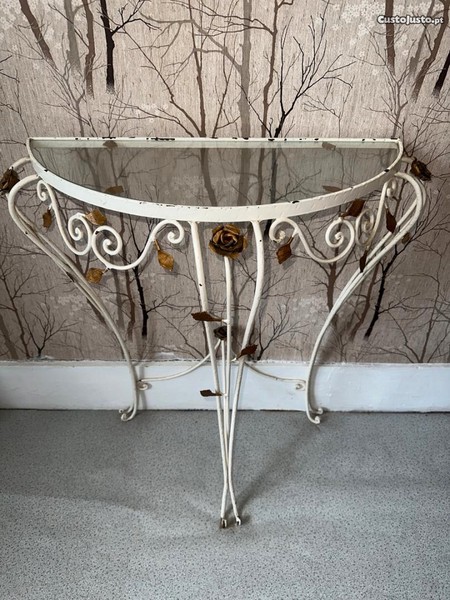 Mesa consola em ferro e vidro, ideal para entrada, em formato meia-lua.