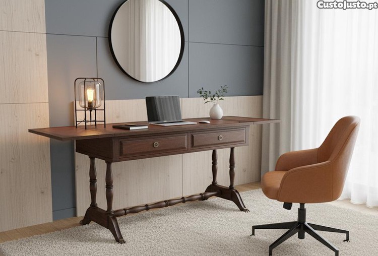Mesa escrivaninha estilo Inglês com abas 2 gavetas tampo em pele falsa