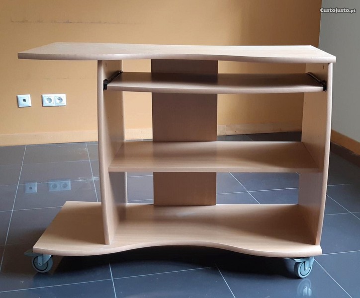 Mesa secretária para equipamento informático (computador, impressora e outros), cor castanho claro (cerejeira), estilo moderno, sólida, resistente, fácil de limpar, muito prática e funcional, com quatro rodas (duas delas com travão) e com uma prateleira extensível.
