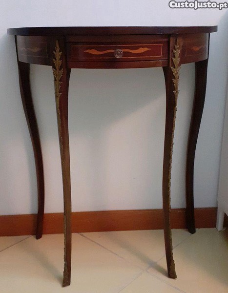 Mesa meia-lua em madeira, aplicações metálicas e marqueteria.