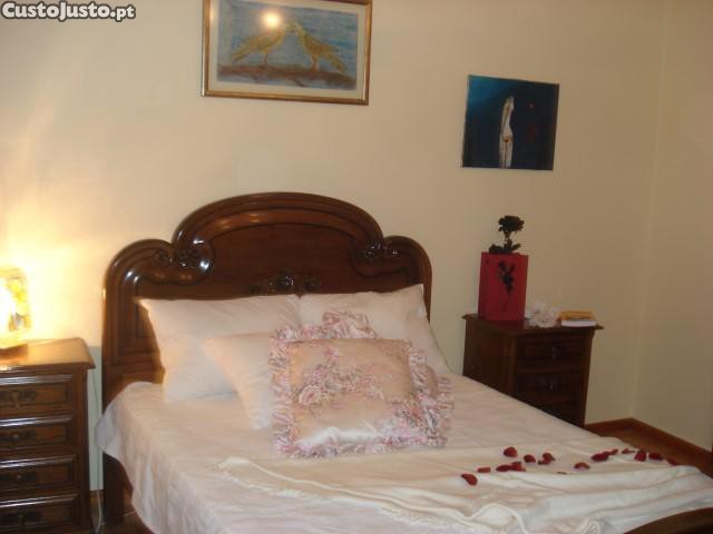 Cama de casal em madeira maçiça com colchão e estrado, duas mesinhas de cabeceira, e um guarda-fato com 4 portas. Em bom estado, mas com algumas marcas de uso.