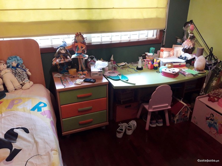 Mobília de quarto de criança com possiblidade de ser montada como berço com 2 gavetões e fraldário ou com cama com 2 gavetões, mesinha de cabeceira e secretária.