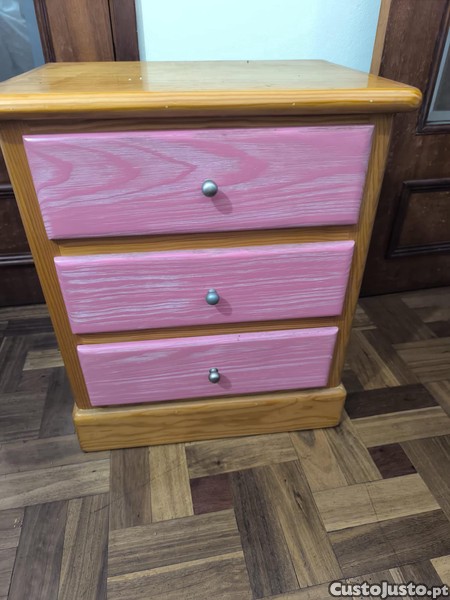 Em pinho maciço e tom de rosa. Só possuo foto da mesa mas as cores da cama são iguais. Oferta de estrados e colchões.