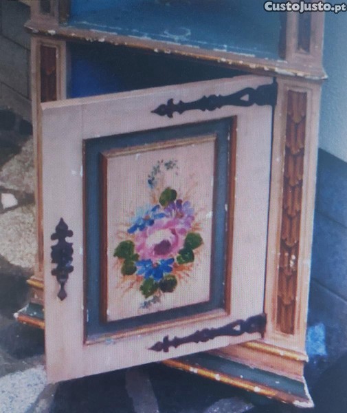 Na parte inferior, é composto por ma porta com 1 almofadas, com ferragens antigas em preto, na parte superior apresenta nico com prateleiras.
