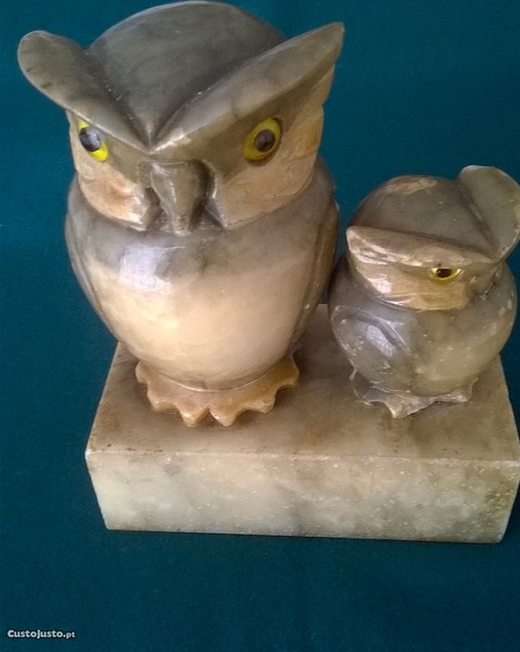 Par de mochos esculpidos em mármore, com base retangular em mármore verde e branca, com pequeno defeito (falhas), visível nas fotos.