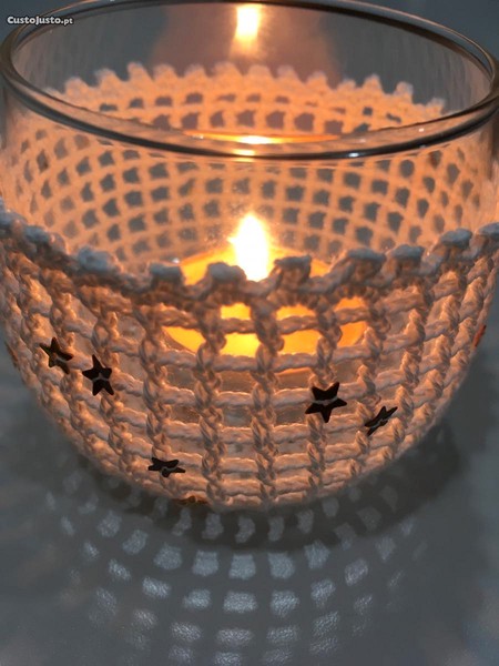 Copo para colocar dentro vela perfumada, decorado com renda em crochet e minusculas estrelas douradas. Trabalho muito perfeito.Possibilidade de confecionar mais 6 iguais sob encomenda.