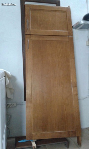 Porta dupla em madeira envernizada para tapar o frigorífico.Tem o marco e as dobradiças para as fixar á parede ou a outro móvel. Estão como novas.