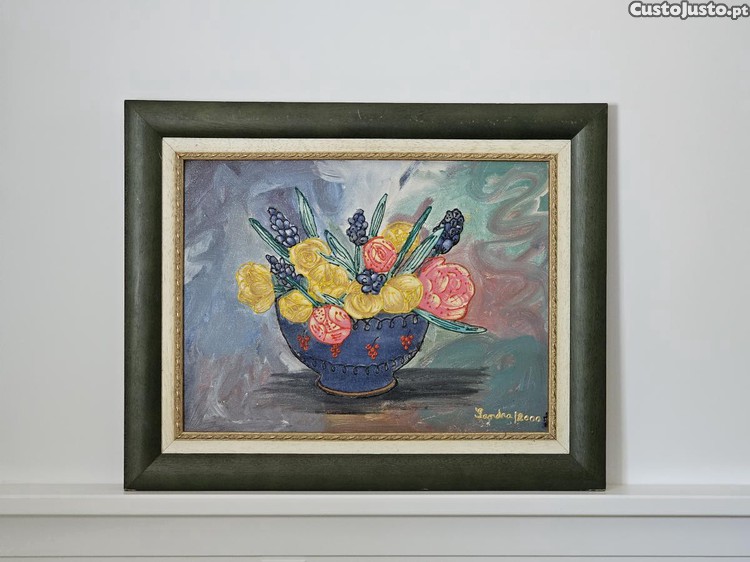 Bonito quadro naïf a óleo em tela. Destaca-se pelas belas flores em cores vibrantes.