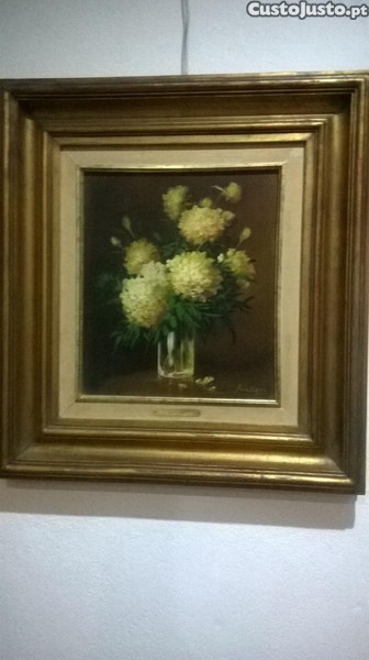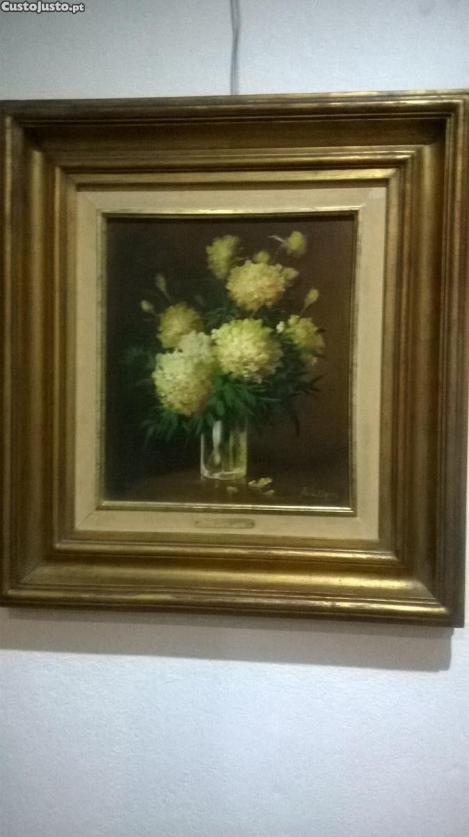 Quadro a óleo de Aníbal Lopes, em moldura de folha de ouro, representando natureza morta (jarra com flores).