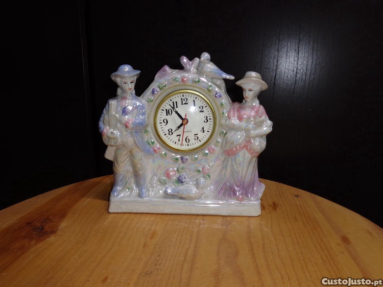 Este relógio de porcelana vintage é um acessório decorativo encantador. Apresenta duas figuras femininas vestidas com trajes coloridos e adornadas com detalhes em relevo. O relógio em si possui um mostrador clássico que funciona corretamente. É um item único que pode trazer um toque de elegância e nostalgia a qualquer ambiente.