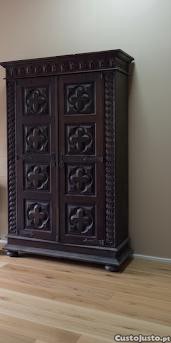 Roupeiro vintage de madeira escura com entalhes ornamentados, possivelmente de estilo gótico ou colonial, como os provenientes de Moçambique.