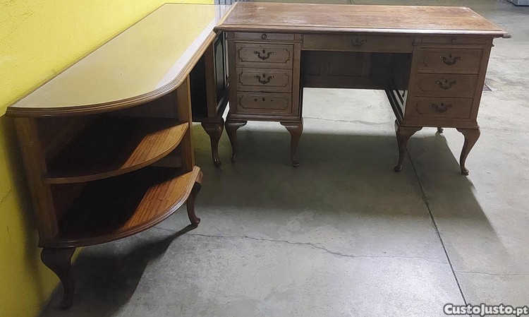 Móvel secretária estilo Victorian com gavetas, e com móvel lateral de apoio com prateleiras.