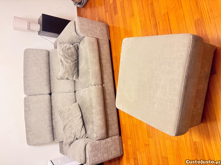 Sofá de dois lugares em tecido beje. Foi feito por medida em Paços de Ferreira. Prático, com design simples, atual e inovador.