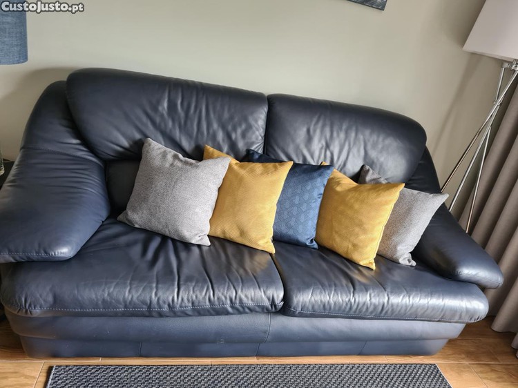 Sofá cama em pele genuína azul marinho. De 3 lugares e 2 almofadas removíveis.