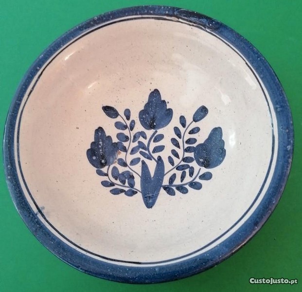 Taça em terracota vidrada C. Vieira - S. Miguel, de 1989, com pintura floral a azul sobre fundo branco.