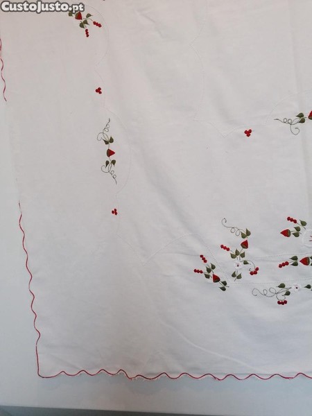Toalha de mesa em algodão branco, com bordado de decoração floral verde/vermelho/branco, em bom estado.