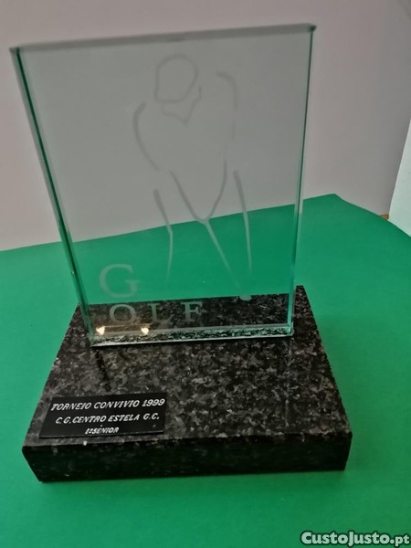 Troféu em vidro lapidado bisotado reto e base em pedra mármore preta de Torneio de Golfe do C. G. Centro Estela G. C..