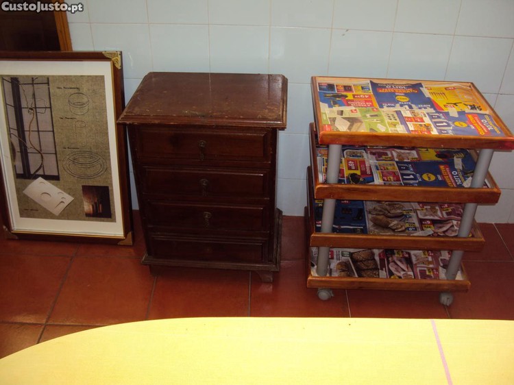 Uma estante para fruta, ou para outra utilidade em madeira maciça 30 EUR- um quadro decorativo uma verdadeira obra de arte 10EUR. Posso vender peças separadas conforme a vontade do já me desfiz da mesa de cabeceira.