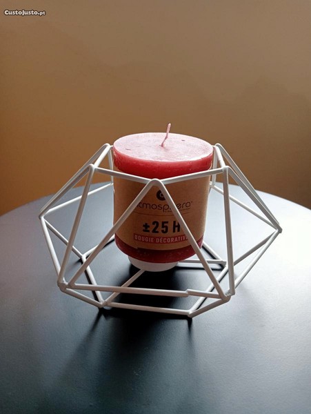 Vela decorativa (cor vermelho) com suporte metálico (cor branco).