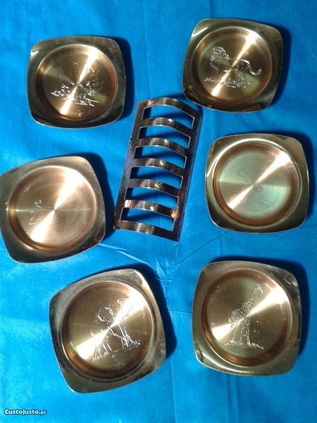 6 bases metálicas com suporte de arrumação - de cor dourada ( cobre ? ) para copos - modelo invulgar com gravação de animais selvagens africanos