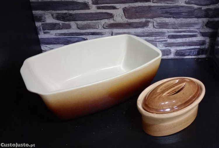 Preço: 12 €Assadeira Grande e alta, barro, beije em degradé + molheira c/ tampa - Entrega a combinar