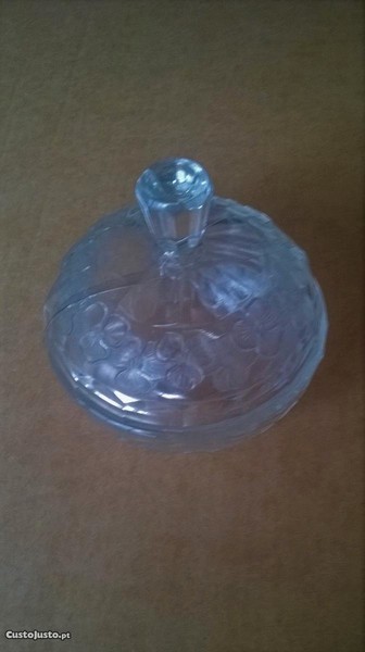 Bomboneira em vidro incolor, redonda, com gravados florais, em muito bom estado.