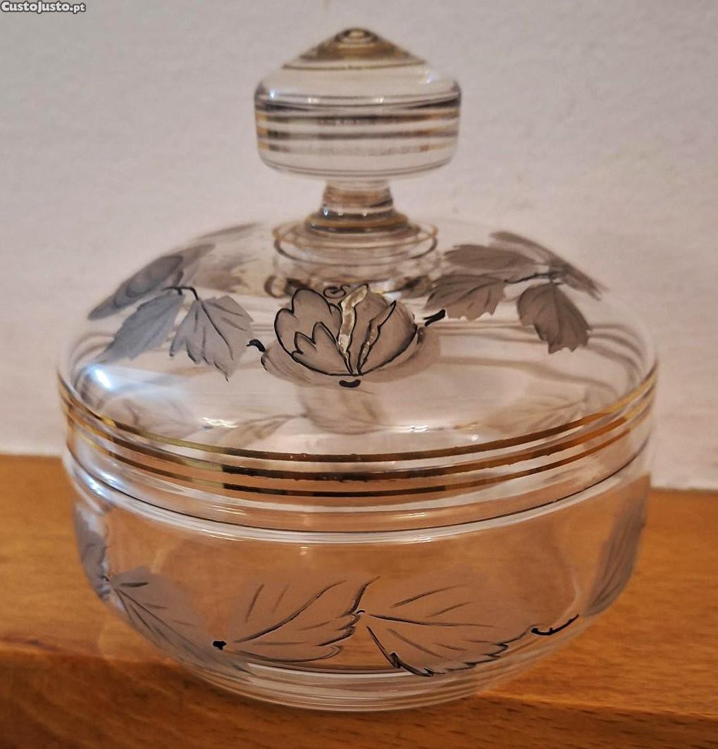 Bomboneira redonda em vidro com decoração de folhas e flores pintadas e relevadas, em muito bom estado.