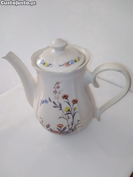 Bule de chá em porcelana Sacavém, com decoração policromada floral sobre fundo branco, tanto na tampa, como no corpo do bule.
